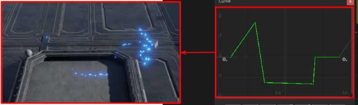 これで、プレイヤーが歩くと床が反応して動くエフェクトの完成です。初期位置に少しランダムな値を加えたり、カーブを調整したりして、好みの動きを探ってみてください。