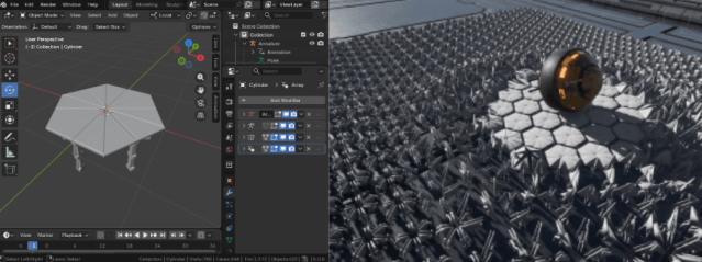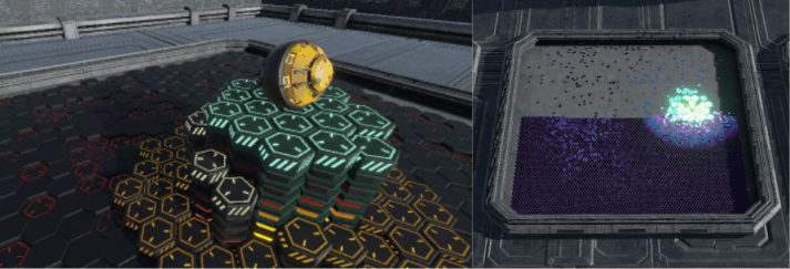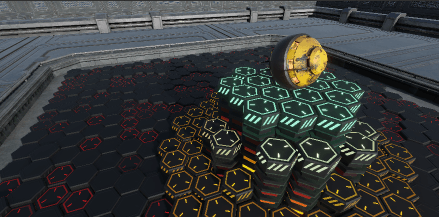 今回は上記のような「指定したオブジェクト(プレイヤー)が近づくと、六角形の床が競り上がり、色が変化する」 というエフェクトの作り方を解説します。