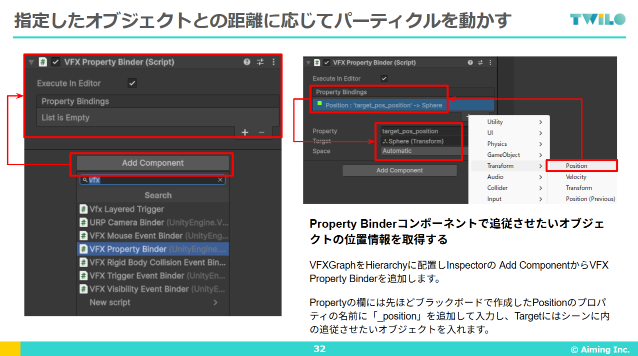 コンポーネント設定:シーンのVFX Graphオブジェクトに VFX Property Binder コンポーネントを追加します。