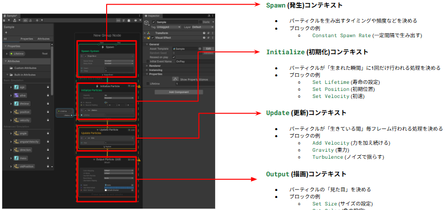 VFX Graphは主に4つのコンテキストを繋ぎその中に「ブロック」と呼ばれる処理単位を配置して挙動を作っていきます。。