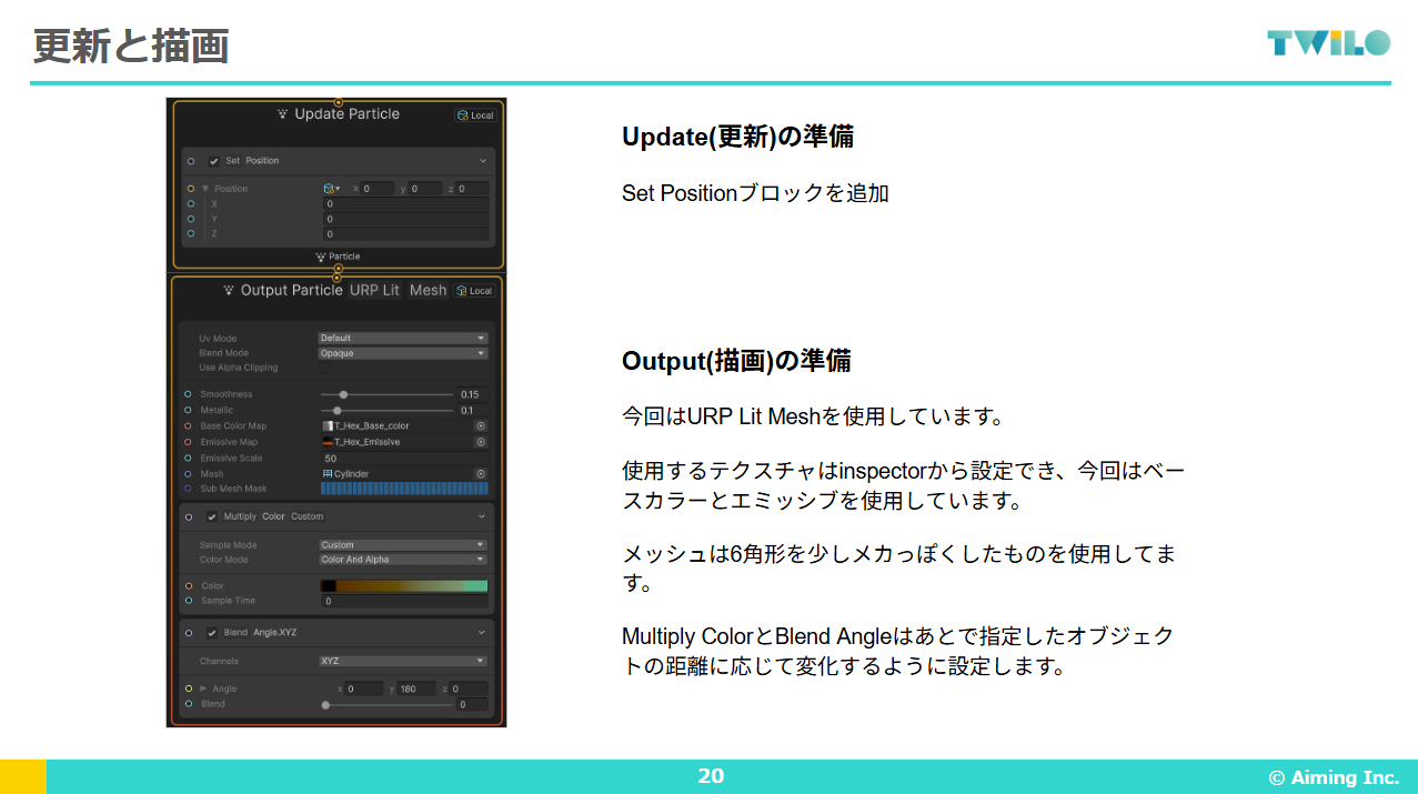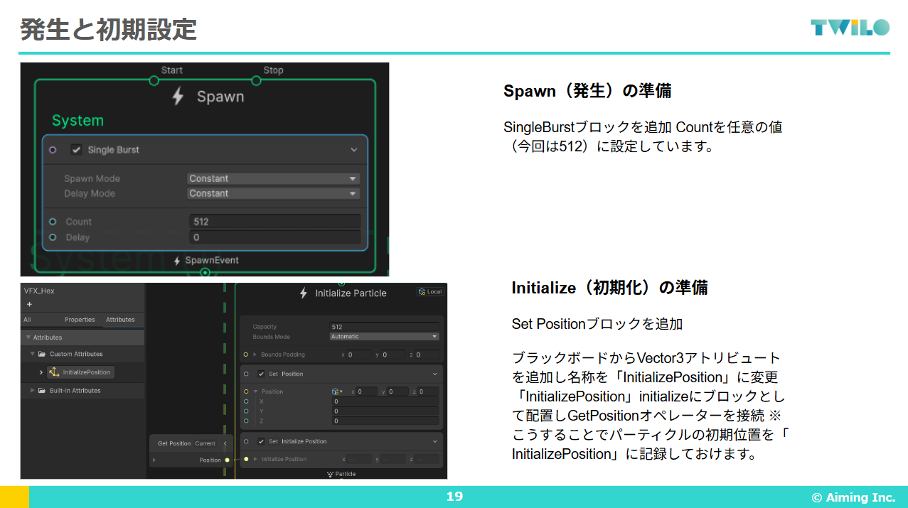 Initialize(初期設定): 生まれた瞬間のパーティクルの初期状態を決めます(例:初期位置、寿命、最初のサイズなど)。