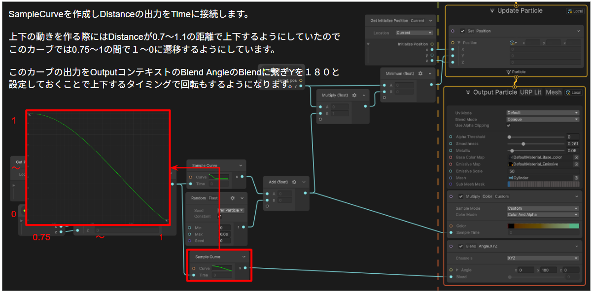 距離をSample Curveに入力し「近いと1、遠いと0」になるようなカーブを描きます。この値を