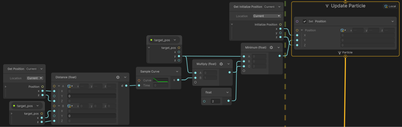 Distanceノードを使用し、パーティクルの現在位置(Get Position)と、ターゲット位置(TargetPos)の距離を測ります。 -