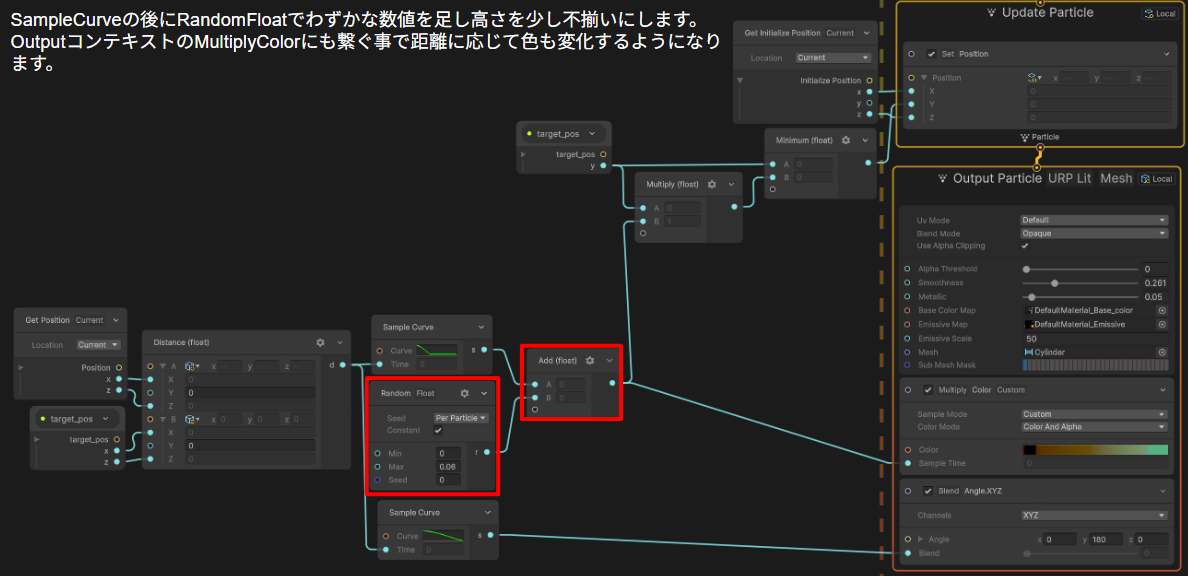 3.指定したオブジェクトが近づいたときにパーティクルの高さが変化するようにする